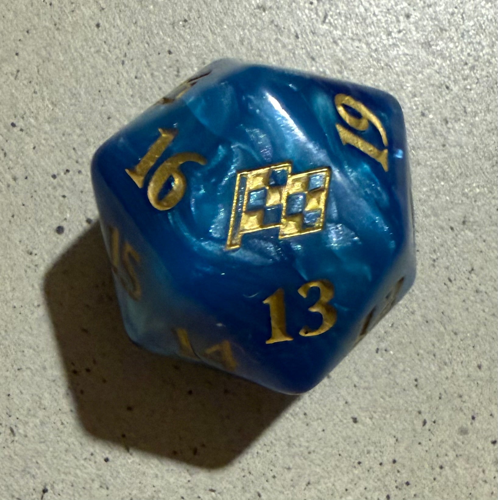 - 1 20-sided blue and gold die featuring the set finish flag symbol.