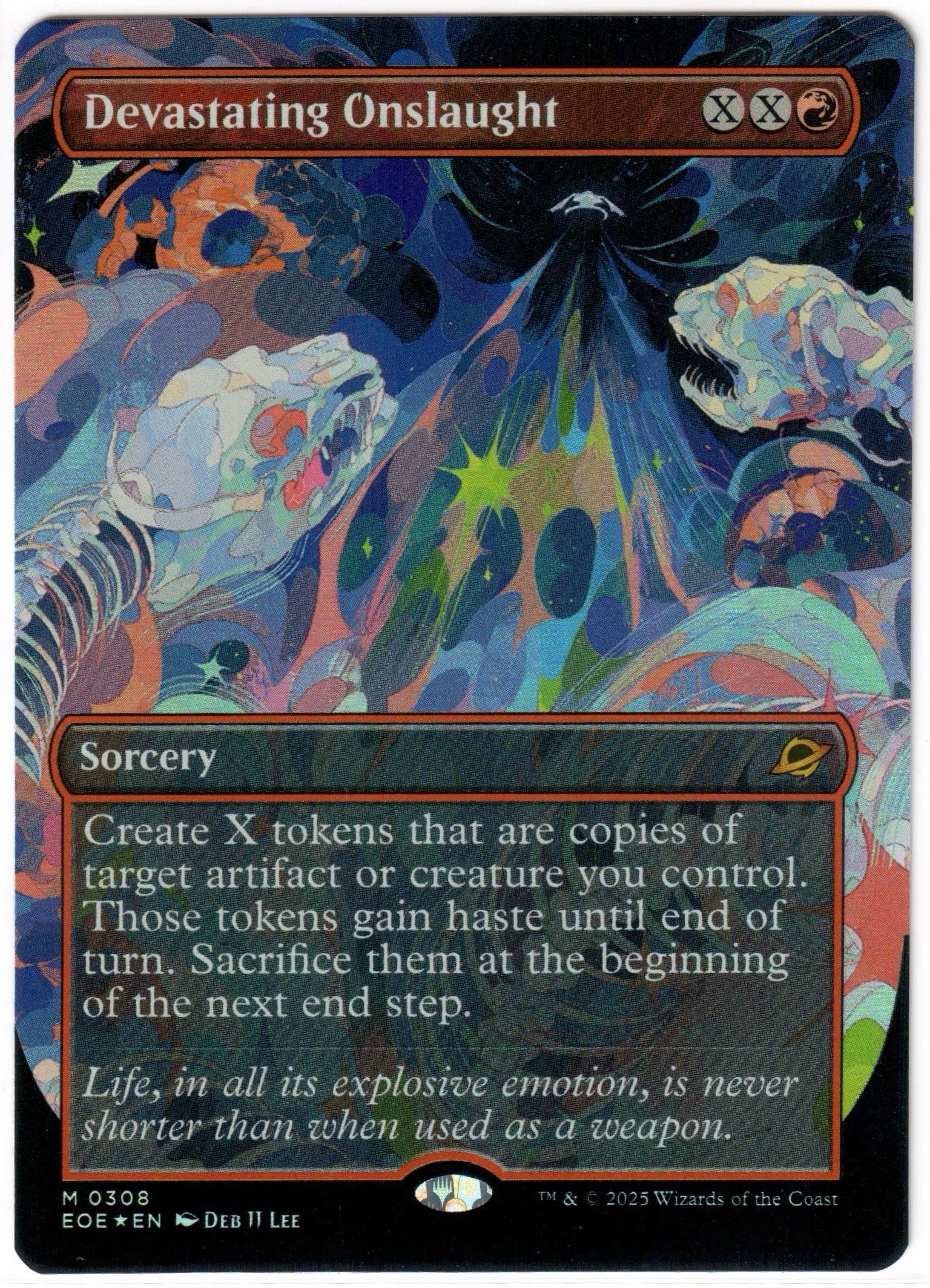 For sale is a straight-from-pack-to-case Devastating Onslaught Borderless FOIL (308) card from the Edge of Eternities set of Magic the Gathering. NON-FOIL. Mint.