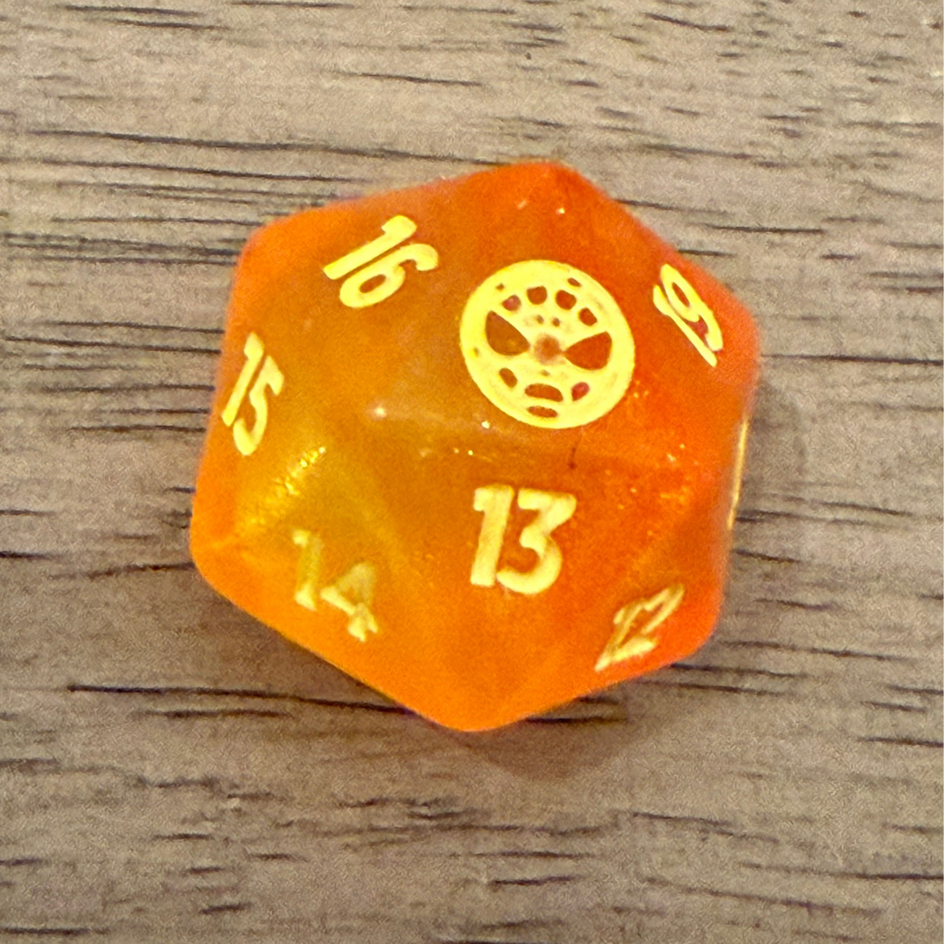 - 1 20-sided orange and yellow die featuring the set symbol.