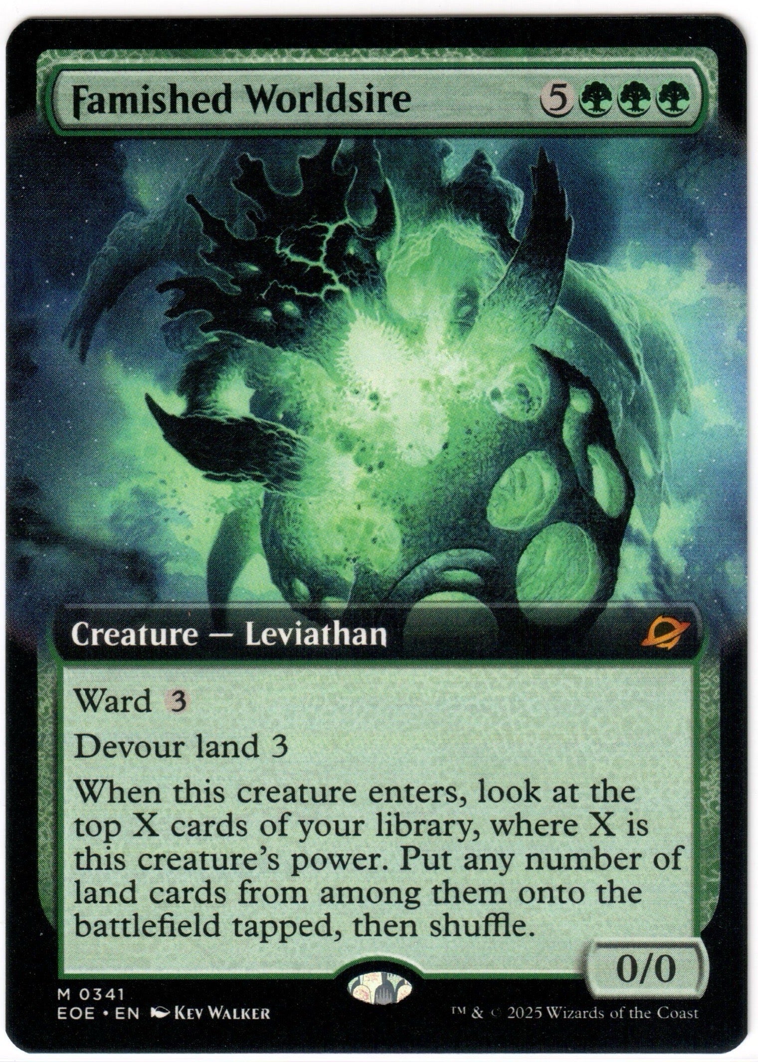 For sale is a straight-from-pack-to-case Famished Worldsire Extended Art (341) card from the Edge of Eternities set of Magic the Gathering. Mint.