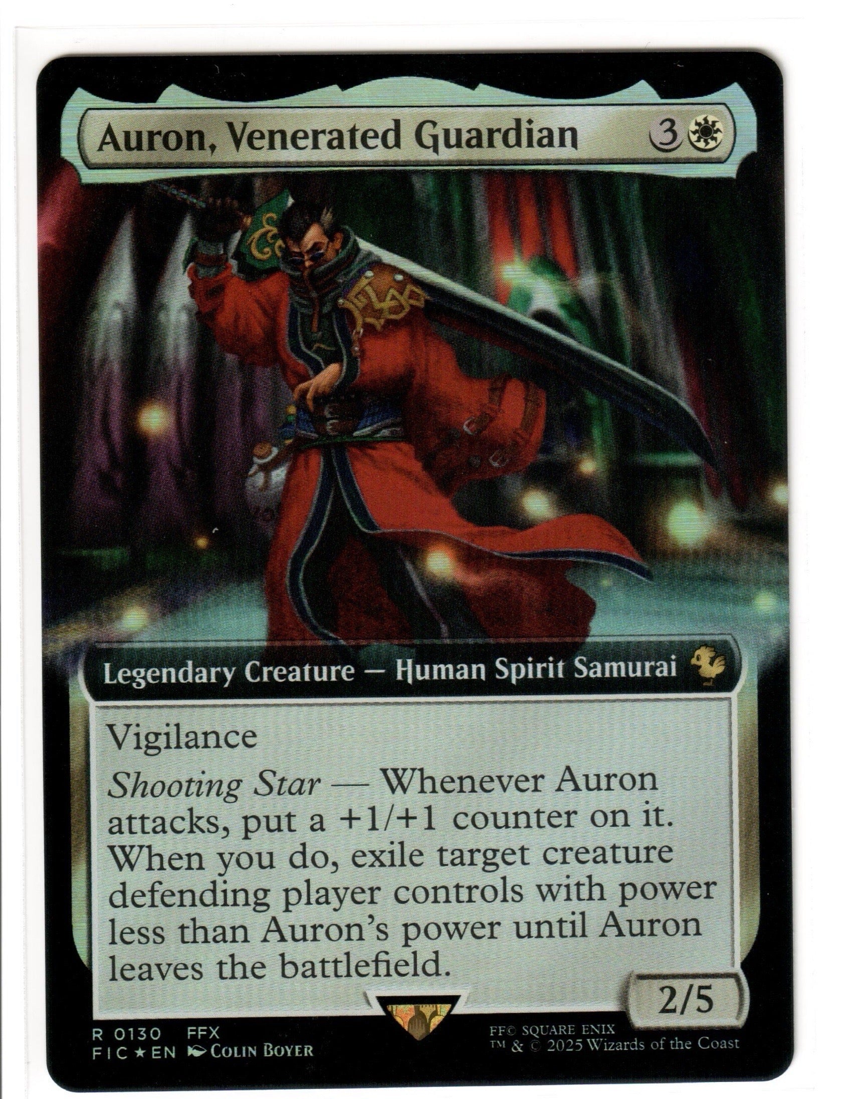 For sale is a mint/near mint condition Auron, Venerated Guardian Extended Art FOIL card from the Final Fantasy set of Magic the Gathering.