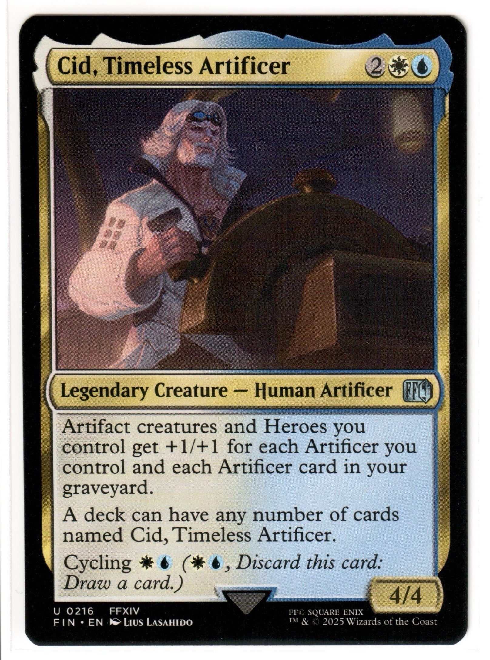 For sale is a mint/near mint condition Cid, Timeless Artificer (216) card from the Final Fantasy set of Magic the Gathering.